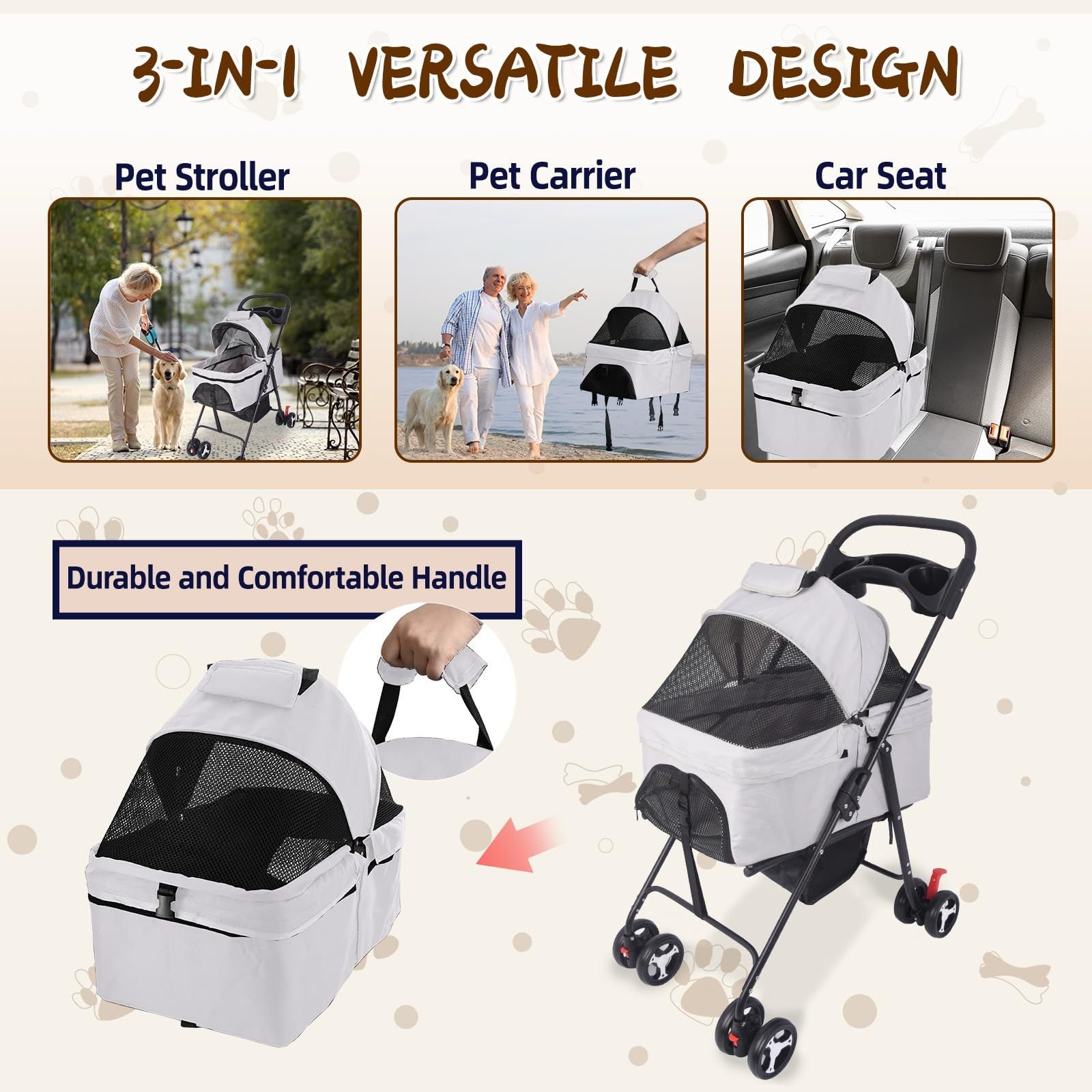 [3 In 1 Versatile Design]Pet Stroller - VAIDPRO folding pet stroller is reasonably designed to provide a comfortable riding space for pets. It has a stable structure and 2 safety belts, as well as 4 sturdy wheels to ensure the safety of pets during walking. Travel Carrier - carry cot of dog cat stroller is removable. Feel free to use it as a backup pet house. Car Seat - It can also be a car seat when sitting in a car. This dog stroller meets your needs for pet travel and provides a better living experience for pets and you.