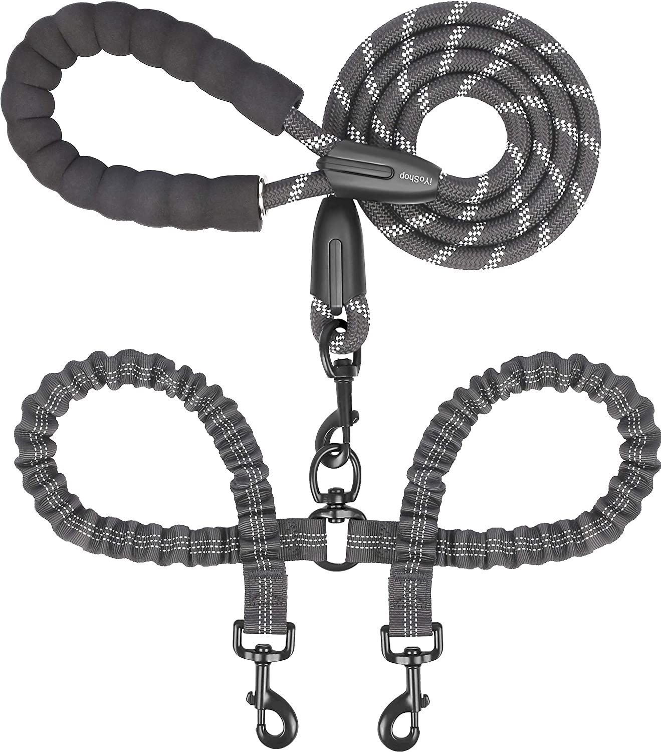 Advantage: 31 inch rope leash + double bungee extension (20 inches - 35 inches) Heavy Duty Design: Climbing rope and tightly woven nylon bungee extension make the iYoShop dog leash more durable but lightweight; heavy duty and easy to clean No Tangle Design: 360° swivel clasp design allows for auto adjusting when dogs criss cross; no limitation for your dogs while moving from side to side without messing the leash Shock Absorbing Bungee Extension: Unique bungee design helps to absorb shock of quick movement when used with energetic and active dogs; reduce the feeling of being pulled. The length of the bungee can be extended from 20 to 35 inch with strong pulling force; which give your dogs enough room to run in front of you or beside you Comfort Padded Handles: Features soft padded handles for amazing comfortable shock grip; and protects your hand from rope burn