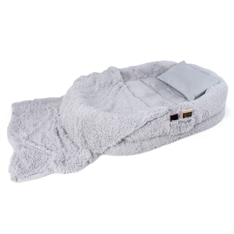 4.Thoughtful Design for Added Convenience: The fluffy human dog bed comes with a soft blanket and a comfy pillow that provide additional warmth and comfort, and convenient side pockets for keeping essential items within easy reach. Besides, when not in use, the bed can be easily folded or rolled up and secured with a durable strap.